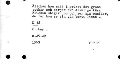 //// Flickan hon satt i gräset det gröna //// suckar oc& sörjer sin älskliga kära //// Flickan stiger upp och ser sig omsider, //// då får hon se sin vän borti liden - //// < //// D 33 //// B. Lur . //// s.25-29 //// ^ 1563 V F F ////