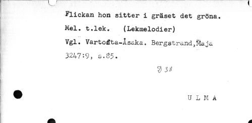 //// Flickan hon sitter i gräset det gröna. //// Mel. t.lek. (Lekmelodier) //// * * //// Vgl. Vartofta-Asaka. Bergstrand,ja //// 3247:9, s.85. //// //// /