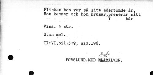 //// * '..... ' - -- -- - . .. .... " .. - . ... ....... - * //// Flickan hon var på sitt adertonde år, //// Hon kammar och hon krusar,preserar sitt //// ? hår //// .. ... .. . //// t //// i //// Visa. 5 str. //// Utan mel. //// II:VI,bil.5:9, sid.198. //// ^ FORSLUND.MED ig^ÄLVEN. ////