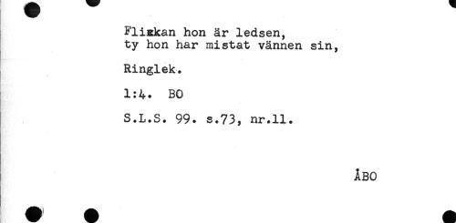 //// Flixkan hon är ledsen, //// ty hon har mistat vännen sin, //// Ringlek. //// 1:4* BO //// S.L.S. 99. s.73, nr.11. ////