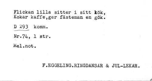 //// Flickan lilla sitter i sitt kök, //// Kokar kaffe,ger fästeman en gök. //// D 293 komm. //// tu:** //// Nr.74, 1 str. //// Mel.not. //// F.EGGELING.RINGDANSAR & JUL-LEKAR. //// . ....^ ////