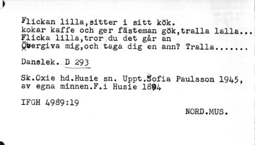 //// Flickan lilla,sitter i sitt kök. //// kokar kaffe och ger fästeman gök,tralla lalla... //// Flicka lilla,tror du det går an //// pbergiva mig,och taga dig en ann? Tralla....... //// Danslek. D 293 //// Sk.Oxie hd.Husie sn. Uppt.éofia Paulsson 1945, //// av egna minnen.F.i Husie 1894 //// IFGH 4989:19 ////