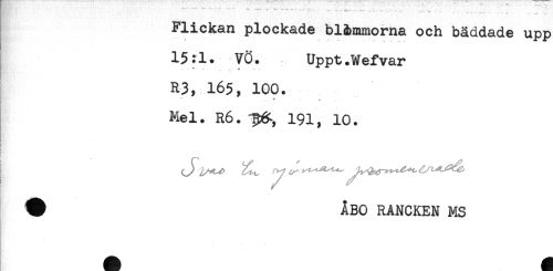 //// Flickan plockade bl&mmoma och bäddade upp //// 15:1. VÖ. Uppt.Wefvar //// f'" //// R3, 165, 100. //// * //// Mel. R6.-p&, 191, 10. //// K' //// W .i' //// ! //// # ÅBO RANCKEN MS ////