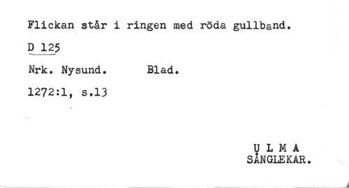 //// Flickan står i ringen med röda gullband. //// D 125 //// Nrk. Nysund. Blad. //// 1272:1, s.13 //// U L M A //// SÅNGLEKAR. //// .-___ ___-.....J ////