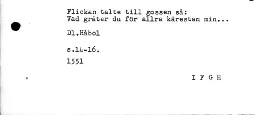 //// Flickan talte till gossen så: //// Vad gråter du för allra kärestan min... //// Dl.Håbol //// s.14-16. //// 1551 //// . I F G H ////