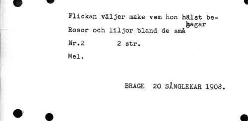 //// Flickan väljer make vem hon hälst be- //// Rosor och liljor bland de små //// Nr.2 2 str. //// Mel. //// ' < //// BRAGE 20 SÅNGLEKAR 1908. ////