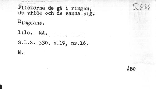 //// Flickorna de gå i ringen, //// de vrida och de vånda sig. //// Ringdans. //// l:lo. MA. //// - - ** -- - ? . . . .. .. . //// S.L.S. 330, s.19, nr.16. //// N. //// ÅBO ////