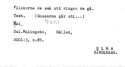 //// flickorna de små uti ringen de gå. //// Text. (Gossarna går uti...) //// Mel. ^ ^ //// Dal.Malingsbo, Hällen, //// 2001:3, s.36. //// U L M A //// SÅNGLEKAR. ////
