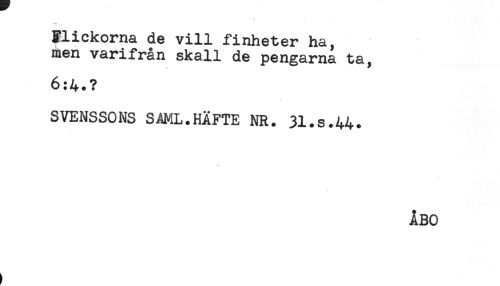 //// Mickcrna de vill finheter ha, //// men varifrån skall de pengarna ta, //// 6:4.? //// SVENSSONS SAML.HÄFTE NR. 31.S.44. //// ÅBO //// t ////