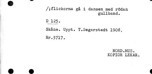//// /;flickorna gå i dansen med rödan //// gullband. //// D 125. //// Skåne. Uppt. T.Segerstedt 1908. //// Nr.5717. //// NORD.MUS. //// KOPIOR LEKAR. ////