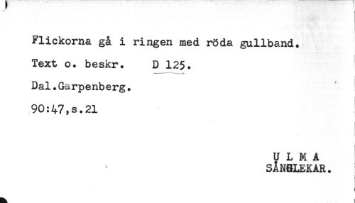 //// - //// Flickorna gå i ringen med röda gullband. //// Text o. beskr. D 125. //// < //// Dal.Garpenberg. //// 90:47,s.21 //// U L M A //// SÅNSLEKAR. //// ! //// t //// ! //// - //// i ////