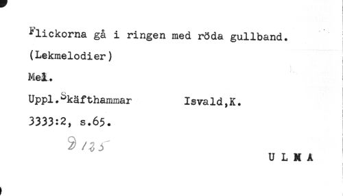 //// Flickorna gå i ringen med röda gullband. //// (Lekmelodier) //// Mel. //// Uppl.^käfthammar Isvald.K. //// 3333:2, s.65. //// U L M A ////