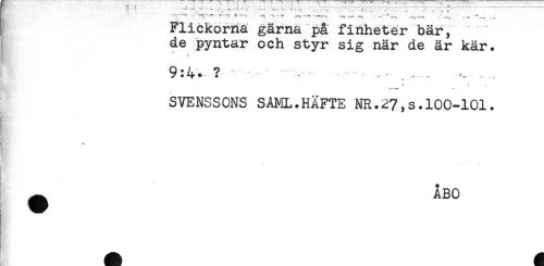 //// '-h-t - ^ . 4. -----.... ^ ., ^ . .......' * " * //// Flickorna gärna på finheter bär, //// de pyntar och styr sig när de är kär. //// 9:4*? . . //// * .. - 4 //// SVENSSONS SAML.HÄFTE NR.27,s.100-101. //// ^ * //// 7 ^ . - ' //// ^ ÅBO ////