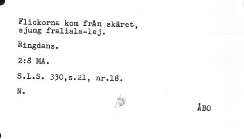 //// Flickorna kom från skäret, //// sjung fraliala-lej. //// Ringdans. //// 2:g MA. //// S.L.S. 330,s.21, nr.16. //// N. ////