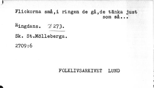 //// Flickorna små,i ringen de gå,de tänka just //// som så... //// Ringdans. Tf273. //// Sk. St.Mölleberga. //// 2709:6 //// i //// FOLKLIVSARKIVET LUND //// = //// S //// __H ////