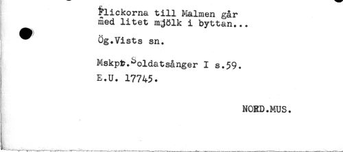 //// Flickorna till Malmen går //// med litet mjölk i byttan... //// ^ Ög.Vists sn. //// H //// g //// T //// Mskpt.^oldatsånger I s.59. //// E.U. 17745. //// NORD.MUS. ////