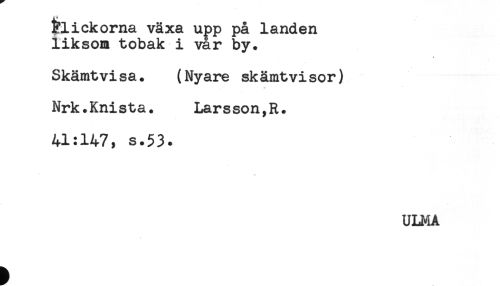 //// flickorna växa upp på landen //// liksom tobak i vår by. //// Skämtvisa. (Nyare skämtvisor) //// Nrk.Knista. Larsson,R. //// 41:147, s.53. ////