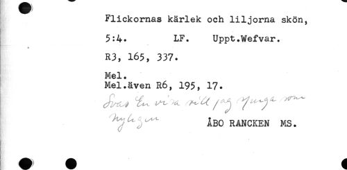 //// Flickornas kärlek och liljorna skön, //// 5:4. LF. Uppt.Wefvar. //// R3, 165, 337. //// Mel. //// Mel.även R6, 195, 17. //// ÅBO RÅNCKEN MS. ////