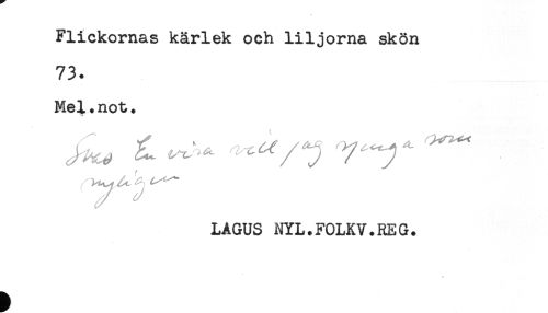 //// Flickornas kärlek och liljorna skön //// 73. //// Mel.not. //// ^ ^ ^ ^ //// / ^ //// LAGUS NYL.FOLKV.REG. ////