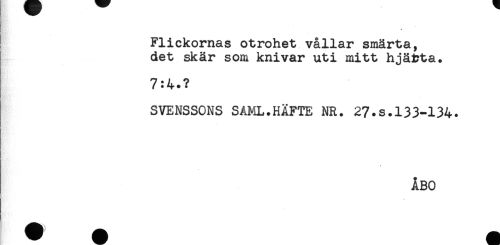 //// Flickornas otrohet vållar smärta, //// det skär som knivar uti mitt hjäirta. //// 7:4.? //// SVENSSONS SAML.HÄFTE NR. 27.s.133-134. //// ÅBO ////