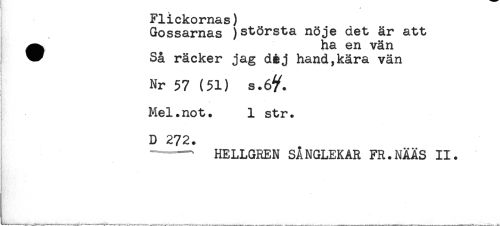 //// Flickornas) //// Gossarnas )största nöje det är att //// ^ ha en vän //// { * Så räcker jag dåj hand,kära vän //// t //// Nr 57 (51) 5.6^. //// Mel.not. 1 str. //// D 272. //// ^ - HELLGREN SÅNGLEKAR FR.NÄÄS II. //// " ^ .LlUt .^TN-th_____- r-rMn-^-m- ^^ ^^ ^ ^ ___H M.._____^ im ////