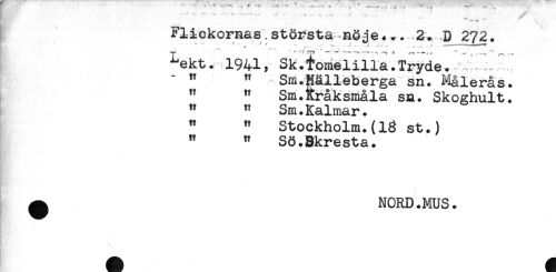 //// - - - ' " - - ... ... 3 ... . j , - //// * - - . ^ //// -v //// FlickorRas.största nöje...2. D 272. //// - - - ^ .. .. ,.. ...... - - --- - //// -^ekt. 1941, Sk.iomelilla.Tryde. -- //// ' " " Sm.Hälleberga sn. I^ålerås. //// " " Sm.Äråksmåla sn. Skoghult. //// " " Sm.Kalmar. //// " " Stockholm.(Ig st.) //// " " Sö.Bkresta. //// ^ NORD.MUS. ////