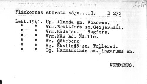 //// ..... . . .....' t f //// , V.....- //// Flickornas största nöje....3. D 272 //// - - . i .- < . ^ < - ,. ____ //// '<. ' r- -: ; i- .t . . __ //// Lekt.1941. Up. Alunda sn. Voxorne. //// " " Vrm.Brattfors sn.Geijersdal. //// " " Vrm.Råda sn. Hagfors. //// " " Vrm.Näs hd. Säffle. //// " " Vg. Göteborg //// " " Vg. gkallsgö sn. ToJ,lered. //// " " Og. Hammarkinds hd. ingarums sn. //// NORB.MUS. //// - ) //// 1. //// ä " i ////