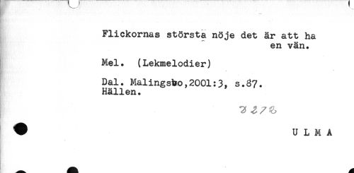 //// . - ^ ; .* //// Flickornas största nöje det är att ha //// en vän. //// - //// * //// Mel. (Lekmelodier) //// Dal. Malingsbo,2001:3, s.37. //// Hällen. //// i 3 //// ^ U L M A //// -t ////