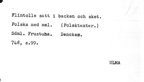 //// \ //// Flintolle satt i backen och sket. //// Polska med mel. (Polsktexter.) //// < //// Sdml. Frustuha. Dencken. //// t //// 743, s.99. //// ULMA ////