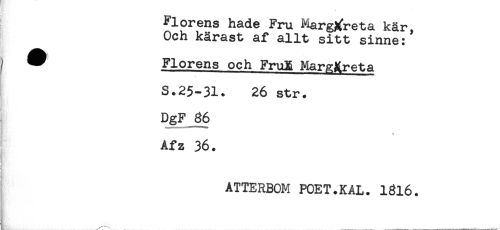 //// Florens hade Fru Margareta kär //// Och kärast af allt sitt sinne:' //// 7 ^ Florens och FruX Margareta //// S.25-31. 26 str. //// gr //// DgF 66 //// Afz 36. //// ATTERBOM POET.KAL. 1316. //// ____ //// . . ___ . - ^ _...__- --.....- - - . - ////