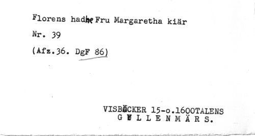 //// Florens hadbfFru Margaretha kiär //// Nr. 39 //// (Afz.36. DgF 36) //// i //// VISBgCKER 15-O.1600TALENS //// GWLLENMÄRS. ////