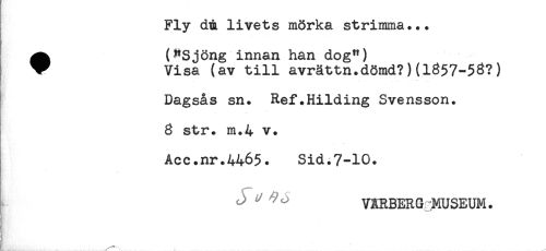 //// Fly dm livets mörka strimma... //// ^ (^Sjöng innan han dog") //// * Visa (av till avråttn.dömd?)(1357-53?) //// Dagsås sn. Ref.Hilding Svensson. //// 3 str. m.4 v. //// Acc.nr.4465. Sid.7-10. //// J ^ J VXRBBRG %USEUM . ////