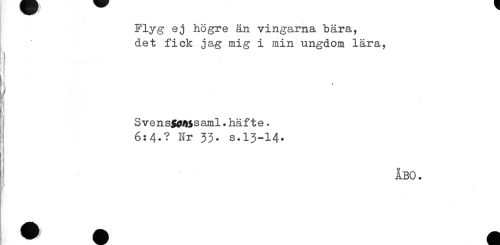 //// Flyg ej högre än vingarna bära, //// det fick jag mig i min ungdom lära, //// SvensjMMsaml. häfte. //// 6:4.? Nr 33- s.13-14. //// & //// ÅBO. ////