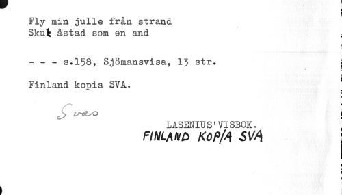 //// Fly min julle från strand //// Skut åstad som en and //// - - - s.158. Sjömansvisa, 13 str. j //// f- //// i //// Finland kopia SVA. ^ //// LASENIUS'VISBOK. //// t //// r ////