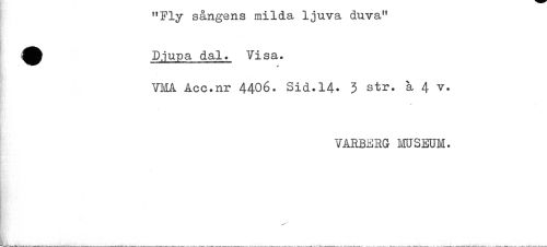 //// "Fly sangens miia.a ljuva auva" //// HO; //// Djupa dal. Visa. //// ^^^^ ** //// VNA Acc.nr 4406. Sid.14- 3 str. ä 4 v. //// VARBERG MUSEUM. //// * //// ... ////
