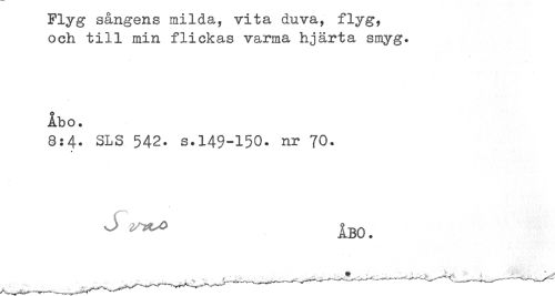 //// Flyg sangens milda, vita duva, iiyg, //// och till min flickas varma hjärta smyg. //// Åbo. //// 8:4- SLS 542. s.149-150. nr 70. //// * //// ^ ^ ÅBO. ////