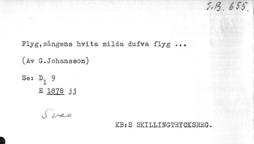 //// '"J. c f y. //// I //// i //// Flyg? sångens hvita milda dufva flyg ... //// (Av G.Johansson) i //// Se: D^ 9 //// E 1378 jj //// j i //// KB:S SKILLINGTRYCKSREG. i ////