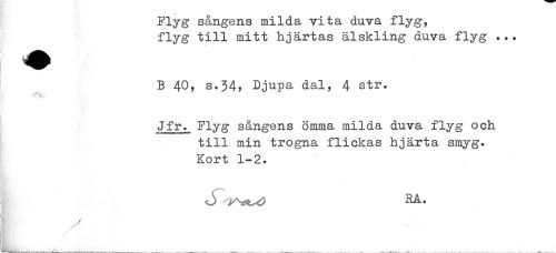 //// Flyg sångens milda vita duva flyg, //// flyg till mitt hjärtas älskling duva flyg ... //// i //// B 40? s.34? Djupa dal, 4 str. //// Jfr. Flyg sångens ömma milda duva flyg och //// till min trogna flickas hjärta smyg. //// Kort 1-2. //// RA. //// § ^ //// L _____. ... ... ////