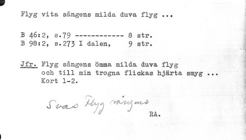 //// - //// B 46:2, s-79---8 str. //// B 98:2, s.273 I dalen, 9 str. //// Jfr. Flyg sångens ömma milda duva flyg //// och till min trogna flickas hjärta smyg ... //// Kort 1-2. //// -'l //// RA # ////