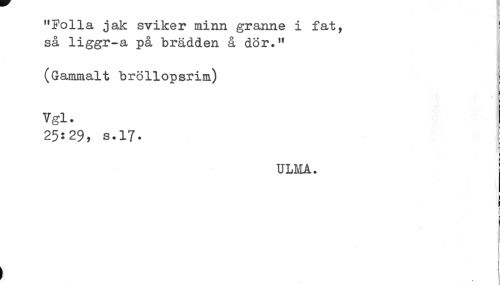 //// "Folla jak sviker minn granne i fat? ! //// så liggr-a på brädden å dor." //// (Gammalt bröllopsrim) //// Vgl. //// 25:29, s.17. //// ULMA. ////