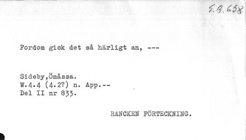 //// t //// ' //// Fordom gick det så härligt an, --- //// Sideby,Ömåssa. //// W.4.4 (4.2?) n. App.- //// Del II nr 833. //// RANCKEN FÖRTECKNING. //// < //// [ ////