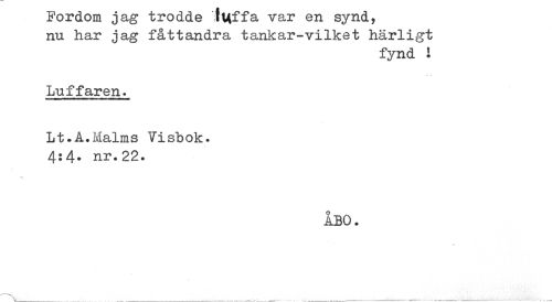 //// Fordom jag trodde tuffa var en synd, //// nu har jag fåttandra tankar-vilket härligt //// fynd : //// Luffaren. //// Lt.A.Malms Visbok. //// 4:4. nr.22. //// ÅBO. //// ____^ ^ ^ . ////
