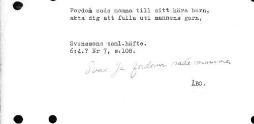 //// ^^ Fordom sade mamma till sitt kära barn, //// akta dig att falla uti mannens garn, //// Svenssons s aml. häft e. //// 6:4.? Nr 7, s.108. //// ÅBO. //// ! //// l ////