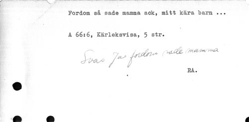 //// Fordom så sade mamma ack, mitt kära barn ... //// A 66:6, Kärleksvisa, 5 str. //// K' //// RA. //// * ////