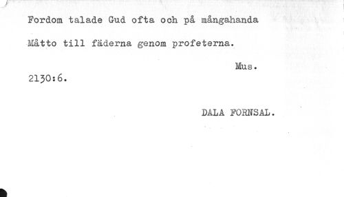 //// . --' //// Fordom talade Gud ofta och på mångahanda //// Måtto till fäderna genom profeterna. //// Mus. //// 2130:6. //// DALA FORNSAL. ////