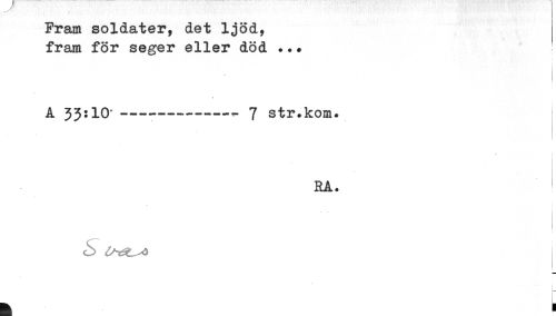 //// Fram soldater, det ljöd, //// fram för seger eller död ... //// * //// A 33:10* ---- 7 str.kom. //// - //// RÅ. //// (b ^^^ i //// < ////
