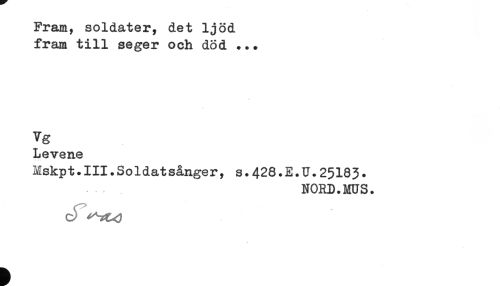 //// Fram, soldater, det ljöd //// fram till seger och död ... //// Vg //// Levene //// Mskpt.III.Soldatsånger, s.428. E. U.25183. //// NORD.MUS. ////