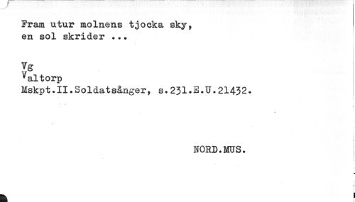//// //// /Fram u.tur molnens tjocka sky, //// en sol skrider ... //// Vg //// Valtorp //// Mskpt.II.Soldatsånger, s.231.E.U.21432. //// t .. //// NORD.MUS. //// i //// [ //// ^ t ////