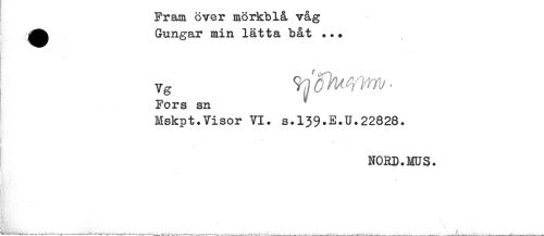 //// Fram över mörkblå våg //// Gungar min lätta båt ... //// - < //// Vg - //// Fors sn //// Mskpt.Visor VI. S.I39.E.U.22828. //// . //// NORD.MUS. ////