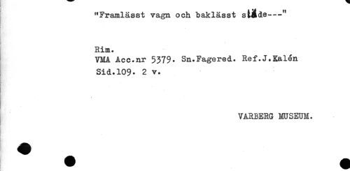 //// "Framlässt vagn och baklässt ståde---" //// t * //// Rim. //// VMA Acc.nr 5379- Sn.Fagered. Ref.J.Kalén //// Sid.109. 2 v. //// VARBERG MUSEUM. //// it //// ty ////
